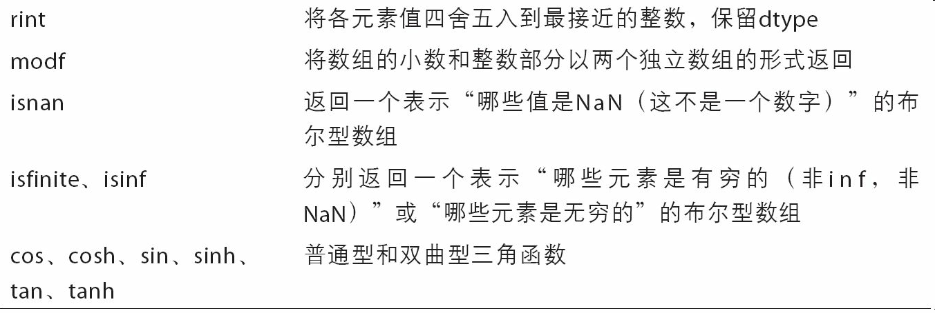 - 用于数据整理和清理、子集构造和过滤、转换等快速的矢量化数组运算。