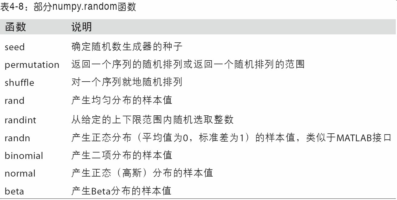 表4-8列出了numpy.random中的部分函数。在下一节中,我将给出一些利用这些函数一次性生成大量样本值的范例。