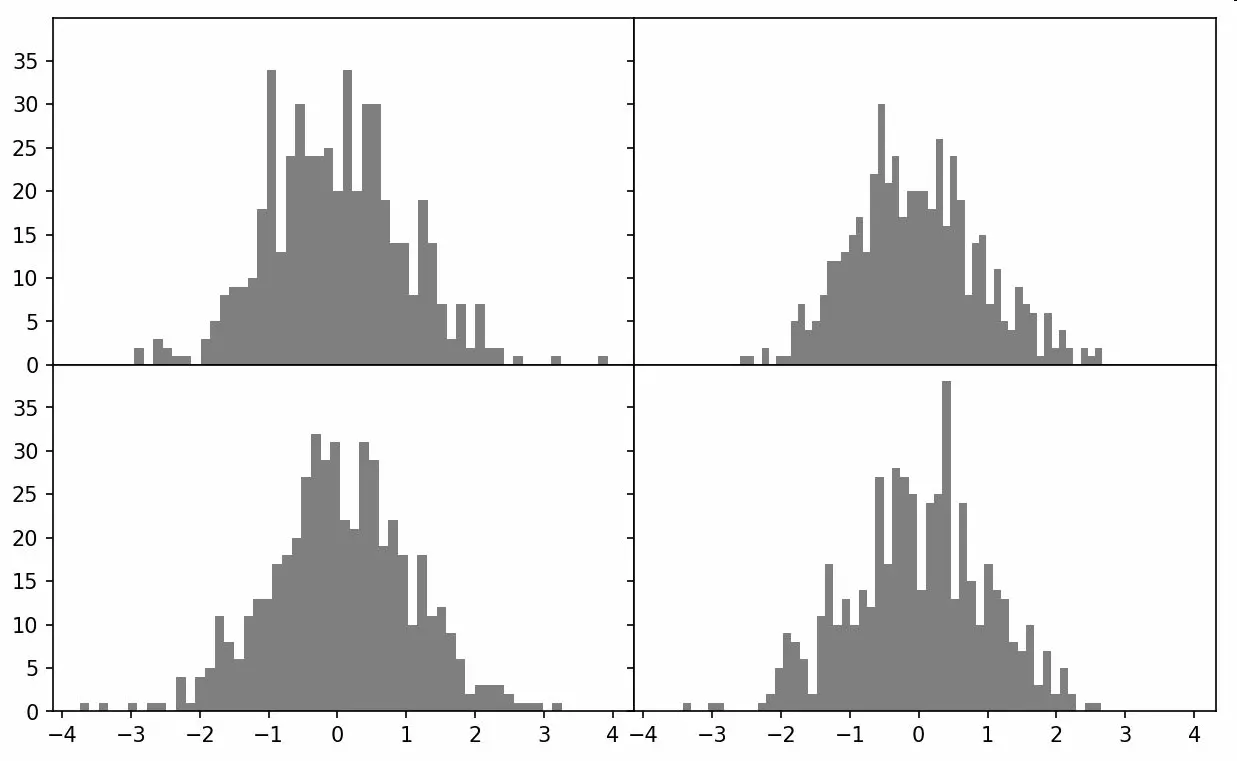 axes[i, j].hist(np.random.randn(500), bins=50, color='k', alpha=0.5)