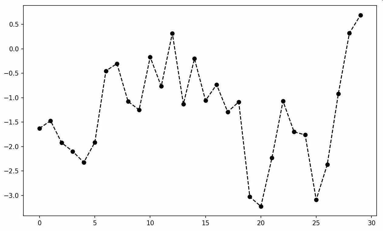 plot(randn(30).cumsum(), color='k', linestyle='dashed', marker='o')