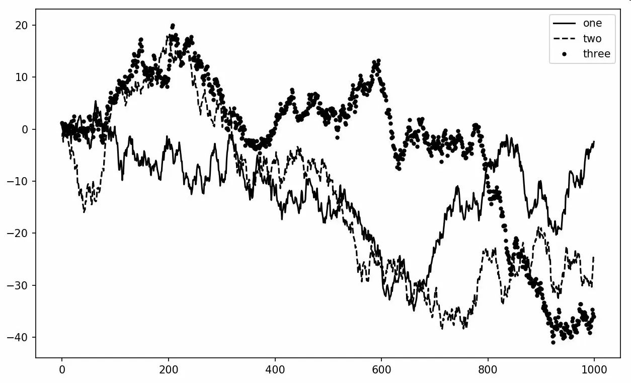 常用的颜色可以使用颜色缩写,你也可以指定颜色码(例如,'#CECECE')。你可以通过查看plot的文档字符串查看所有线型的合集(在IPython和Jupyter中使用plot?)。