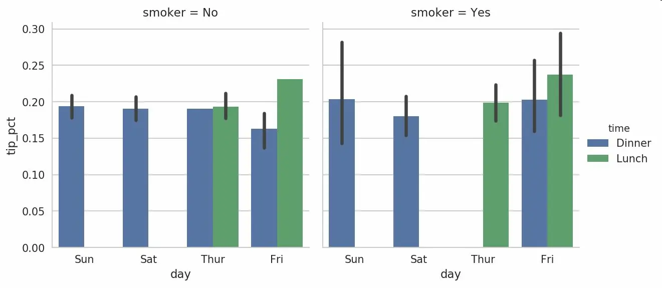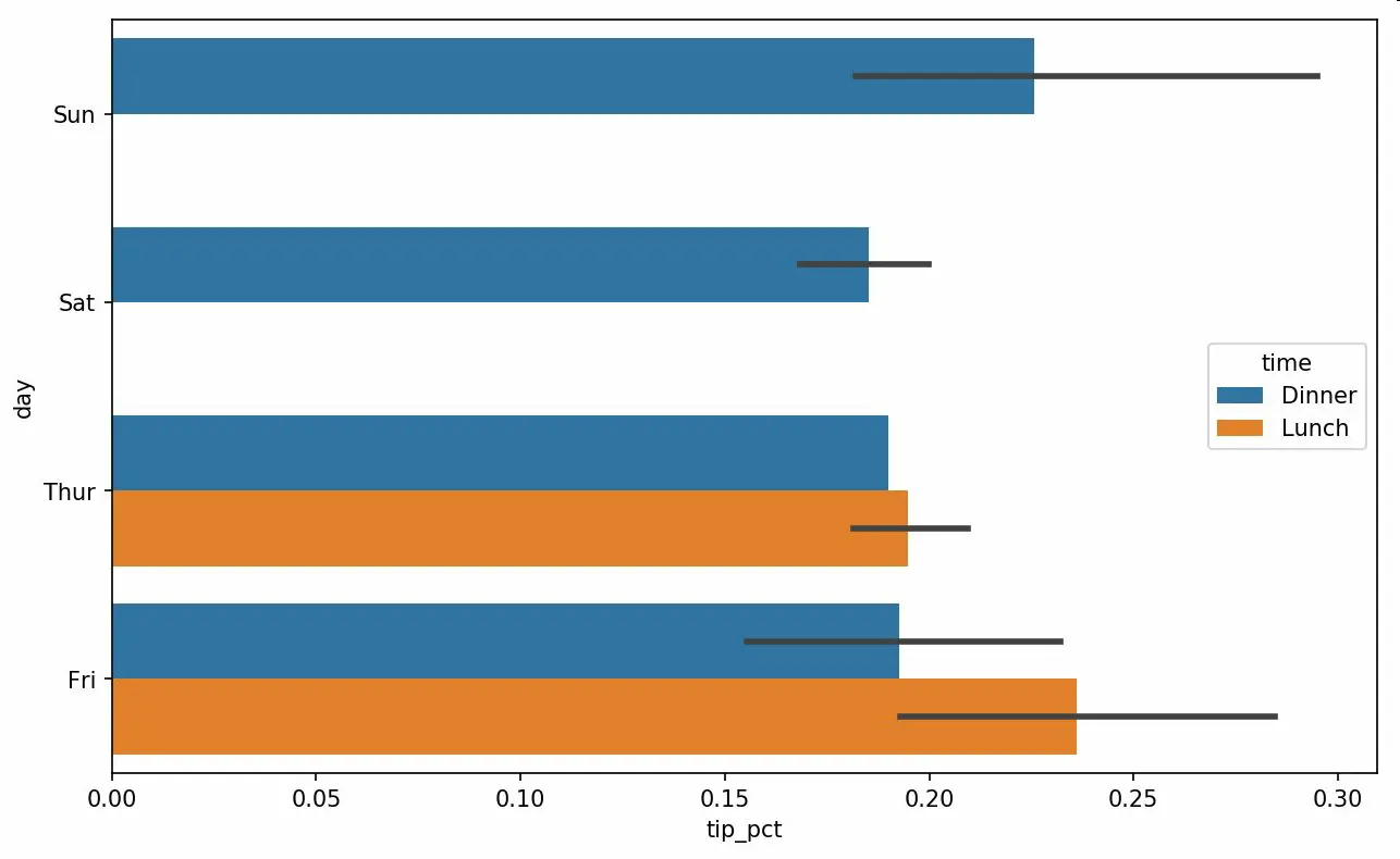 seaborn的绘制函数使用data参数,它可能是pandas的DataFrame。其它的参数是关于列的名字。因为一天的每个值有多次观察,柱状图的值是tip_pct的平均值。绘制在柱状图上的黑线代表95%置信区间(可以通过可选参数配置)。