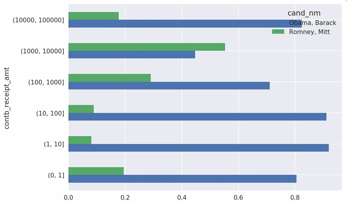 现在可以根据候选人姓名以及面元标签对奥巴马和罗姆尼数据进行分组,以得到一个柱状图: