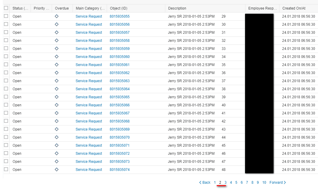 1. 搜索按钮点击后,会有max hit的值指定条数的记录从数据库取出,存储于WebClient UI的应用的内存区域中。在我的例子里,我指定的max hit为200,因此有200条Service Request从数据库里取出。
