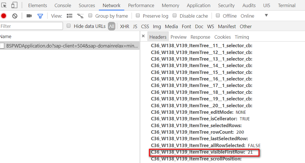 那么后台如何得知应该从第21行开始准备其html源代码呢?这个索引信息是从前台传到后台的,通过http请求头部的字段:ItemTree_visibleFirstRow.