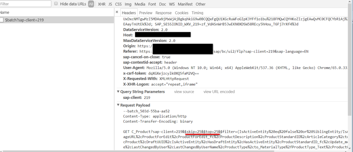 然后再去GrowingEnablement.requestNewPage这一个调用栈,发现一个属性_iLimit维护了一个开始索引,每次scroll到底部的事件触发之后,该属性值都会被GrowingThreshold累加。 因为API this._oControl.getGrowingThreshold每次返回的是一个常量25, 因此_iLimit的值每次scroll到底部之后看起来是这样的:25,50,75,100 ... 这些值会被用来作为HTTP请求参数$skip的值传到后台: