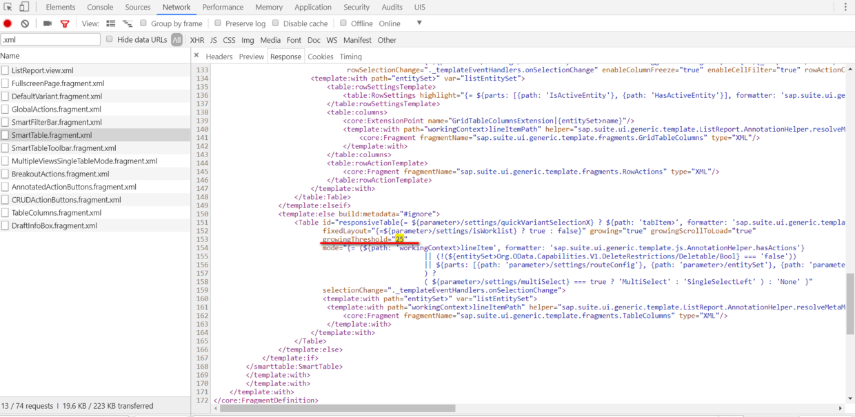 在Chrome开发者工具查看从ABAP后台加载的库文件SmartTable.fragment.xml,能发现属性growingThreshold在此处被硬编码成25。