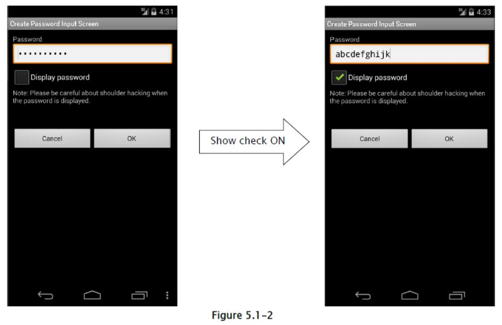 智能手机的密码输入通过触摸面板输入完成,因此与 PC 上的键盘输入相比,容易发生误输入。由于输入不便,用户可能会使用简单的密码,这样做会更危险。此外,当有多次密码输入失败导致帐户锁定等机制时,必须尽可能避免误输入。作为这些问题的解决方案,通过准备以纯文本显示密码的选项,用户可以使用安全密码。
