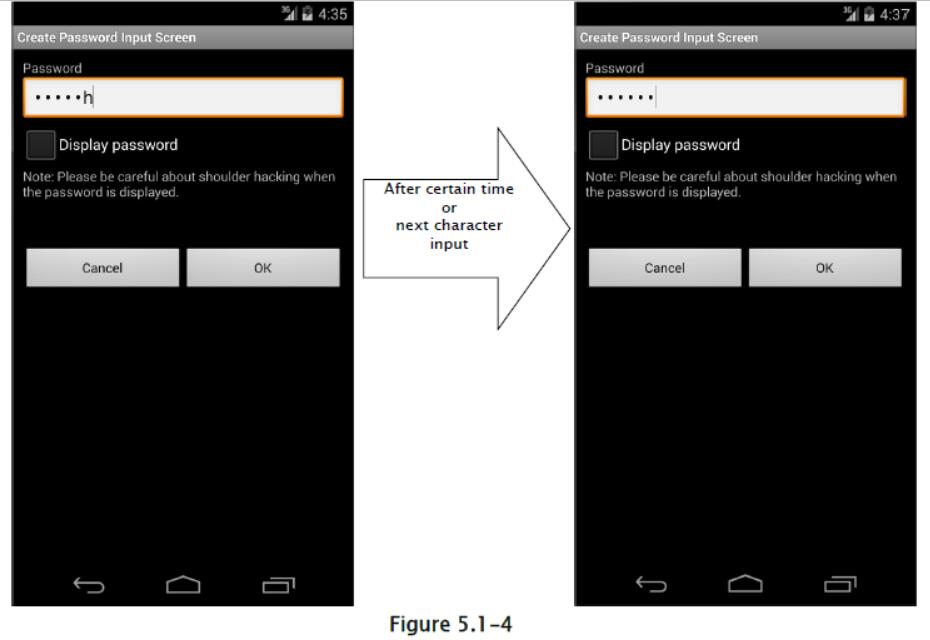 智能手机通常用在火车或公共汽车等拥挤的地方,而且存在密码被某人偷窥的风险。 因此,屏蔽显示密码的功能是应用规范所必需的。
