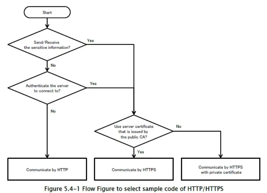 具有网络通信的智能手机应用是“系统”和 Web 服务器的一部分。 而且你必须根据整个“系统”的安全设计和编码,为每个通信选择 HTTP 或 HTTPS。 表 5.4-1 用于比较 HTTP 和 HTTPS。 表 5.4-2 是示例代码的差异。