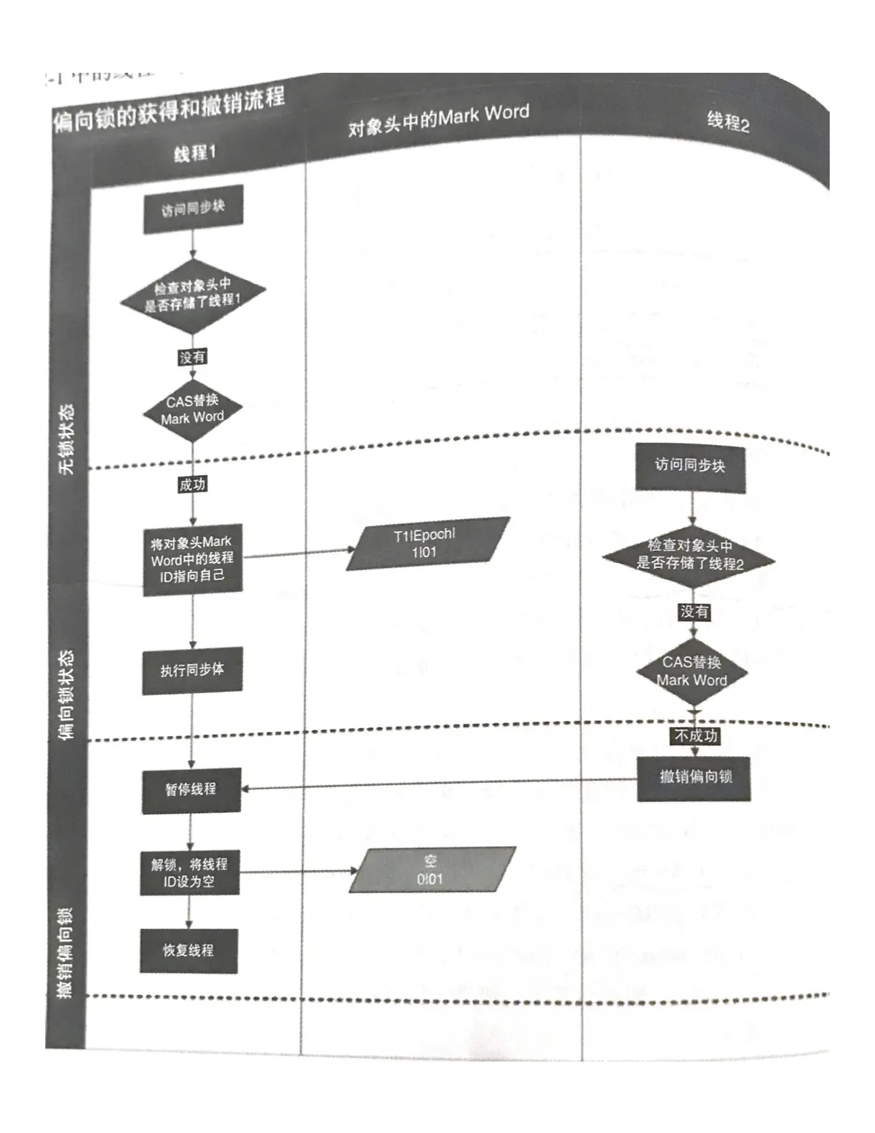 多数情况下,锁不会存在竞争,而是同一个线程多次获得。当某个线程访问同步块代码时,会将锁对象和栈帧中的锁记里存储锁偏向的线程ID,以后线程在进入和退出同步块时不需要进行CAS操作来加锁和解锁,只需简单比对一下对象头中的MarkWord里的线程ID,如果一致则表示线程获得锁。若不一致,再继续测试偏向锁的标识是否为1:如果没有设置(无锁状态),用CAS(Compare and Swap)竞争锁;如果设置了,尝试使用CAS将对象头的偏向锁指向当前线程。