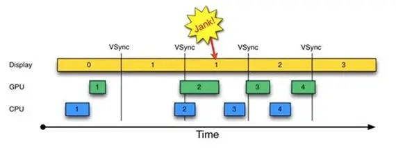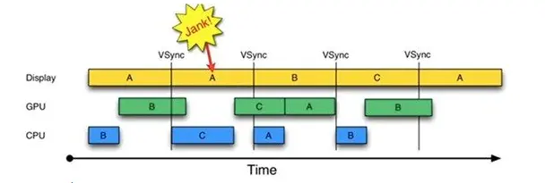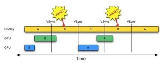 在第二个16ms时间段,Display本应显示B帧,但却因为GPU还在处理B帧,导致A帧被重复显示。