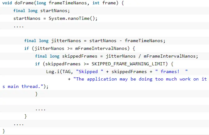 当VSYNC信号到达时,doFrame就会被调用,而doFrame这里可以得出SF指标(Skipped Frame),简单理解就是丢帧,而执行doFrame是实现屏幕刷新;