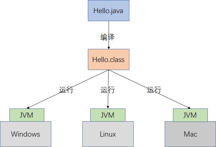 目前很多语言都是混合了解释和编译,例如Java,如下图所示,Java编译器先把Java编译成Class文件,然后在各个JVM上解释执行,由于每个平台对应一个JVM,因此Java是跨平台的。由于2-8原则的存在,JVM发现一段代码经常执行,那么,JVM将这段代码编译成本地代码,即如果有热点代码,就编译成本地代码(Native Code)。