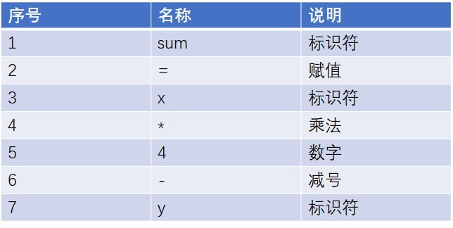 针对上面这行代码,计算机首先要做词法分析,将代码变成一个个token。下图中的每一行表示一个token。