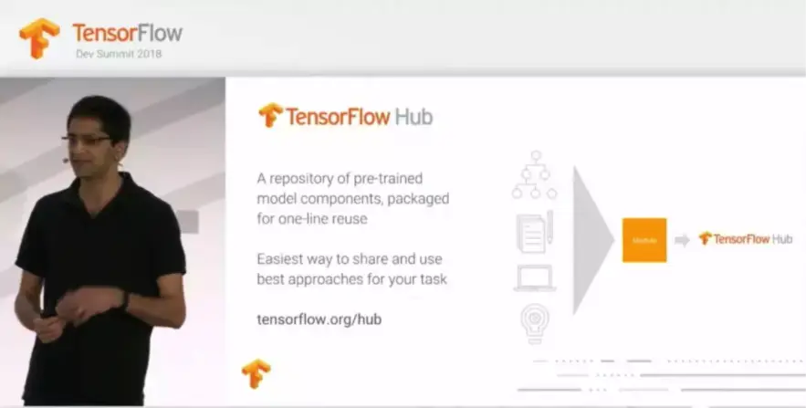包括TensorFlow Hub。“旨在促进模型的可重复使用部分的发布、发现和使用……它们包含了已在大型数据集上预先训练好的变量,并且可以用一个较小的数据集进行再训练,来提高泛化能力,或是加速训练”。