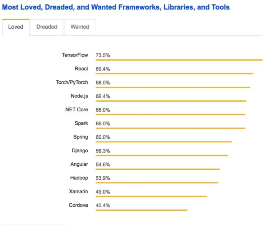 报告称:机器学习框架在开发者们心目中形象不错,TensorFlow荣登程序员最爱榜榜首,有73.5%正在用它的程序员表示还想继续用,Torch/PyTorch排在第3名,68%用户打算继续用下去。