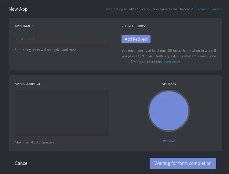 我们首先要创建一个机器人账号。 转到 discordapp.com/developers/… 然后创建一个新的 app。 给您的机器人起一个好听的名字,并给它配上一张个人资料图片。