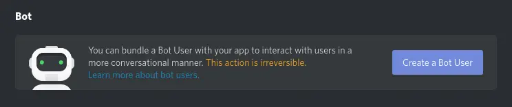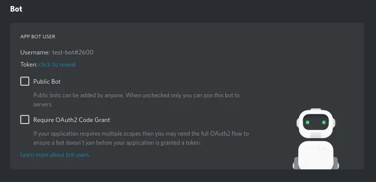 向下滚动并点击"Create Bot User"。 完成后您将得到一个机器人的私密 token。