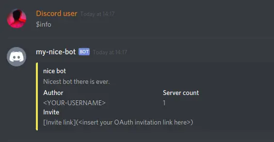 有个信息命令。 它应该提供关于机器人的信息,比如它使用的框架,框架用的是哪个版本以及帮助命令,最重要的一点是,它的开发者是谁。