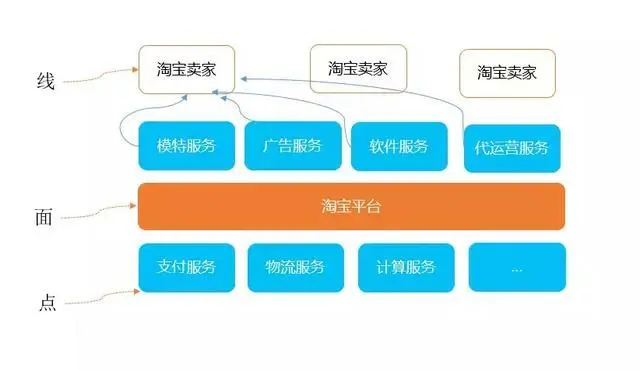 在淘宝平台这个面上,要让淘宝卖家赚点钱,淘宝才能发展。模特服务、广告服务等都是为线(卖家)或者面(淘宝平台)服务的。难得的是这些点和线形成了网络协同效应,这样就比纯粹上下游关系的模式多了很多种可能。
