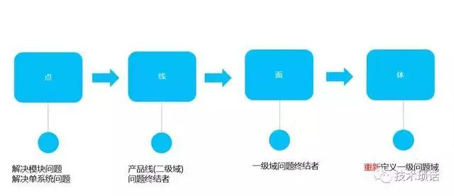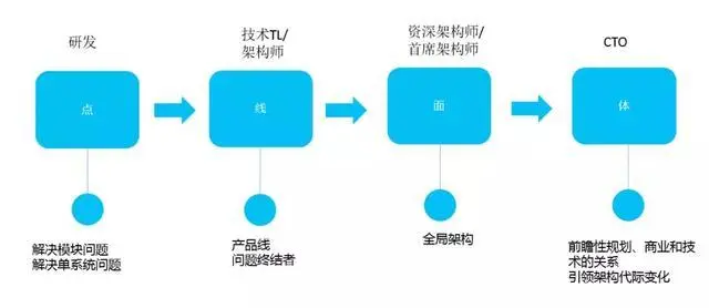 从面到体,就技术人员发展而言,我认为有2条途径,比如从一级域的问题终结者到全域架构,视野俯瞰是整个公司的技术架构;也可能是从架构师角色走向管理岗,比如CTO。