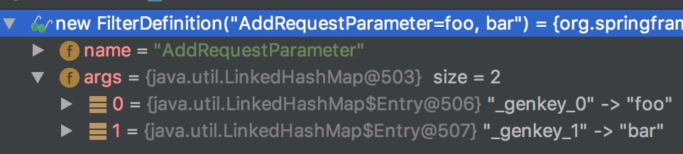 name属性,过滤器定义名字。通过name对应到org.springframework.cloud.gateway.filter.factory.GatewayFilterFactory的实现类。例如说,name=AddRequestParameter对应到 AddRequestParameterGatewayFilterFactory 。args属性,参数数组。例如,name=AddRequestParameter/args={"_genkey_0": "foo", "_genkey_1": "bar"},添加请求参数foo为bar。