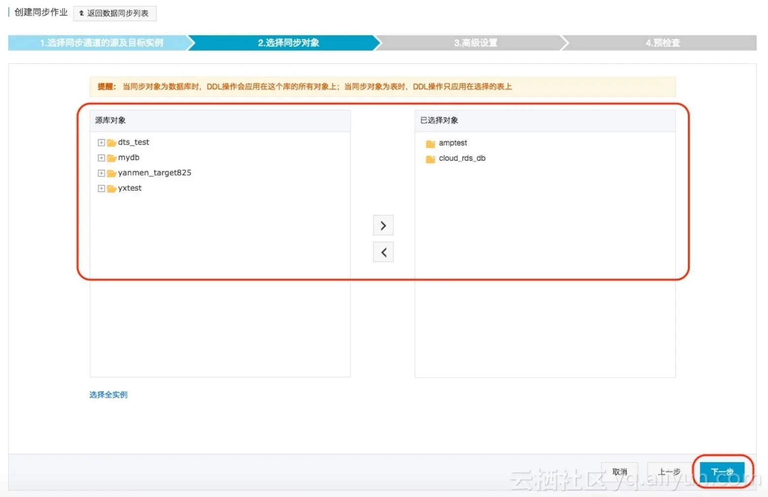 - 进入DTS控制台,配置需要同步的源实例及目标实例的连接方式、选择需要同步的库或表