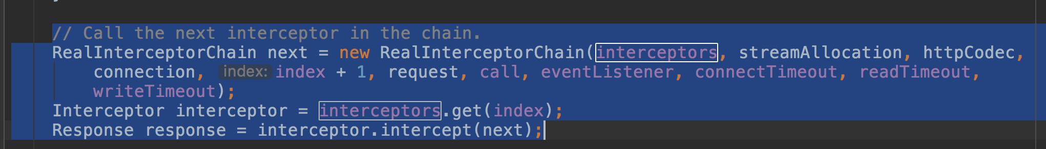 RealInterceptorChain next = new RealInterceptorChain(interceptors, streamAllocation, httpCodec,
