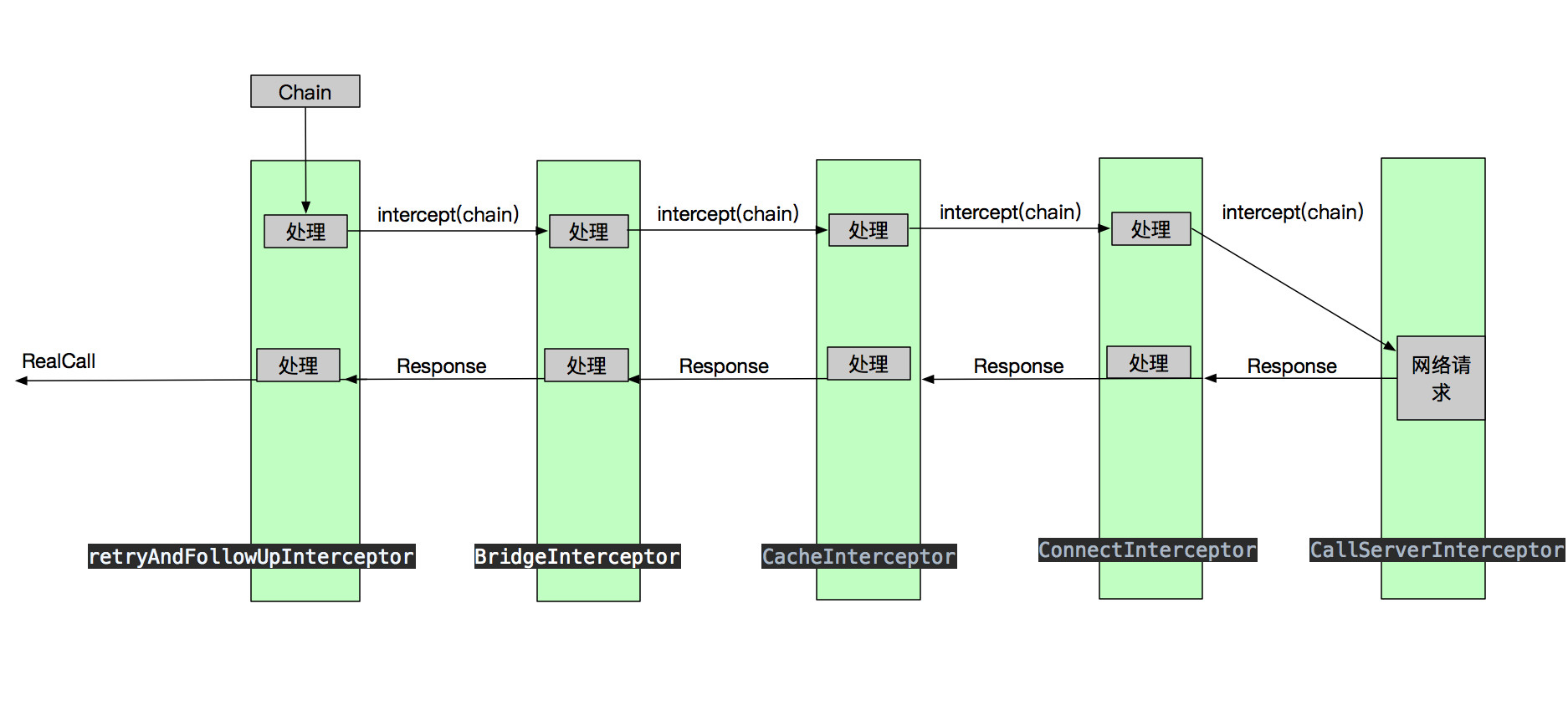 这里有多少个拦截器就会递归调用多少层最后返回来。顺便告诉大家这样的设计模式叫责任链模式。我也不会解释,嘴很笨。画个图也许大家就明白了,图中假设我们没有自定义的添加interceptor 使用的只有ok内部的几个。