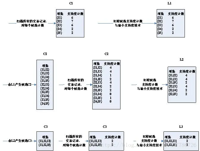 每次交易的所有商品为一个集合设位Y={.....},X为二元集合,计算X的支持度,则需遍历每个集合Y,查找Y中是否含有与X相同的子集,如果有,则其支持度计数加1,直到得到其最后的支持度F(Xn);在所有X集合的基础上建立集合Z,Z为三元集合,含有3个商品元素,同样遍历所有商品记录,计算Z所对应的支持度、