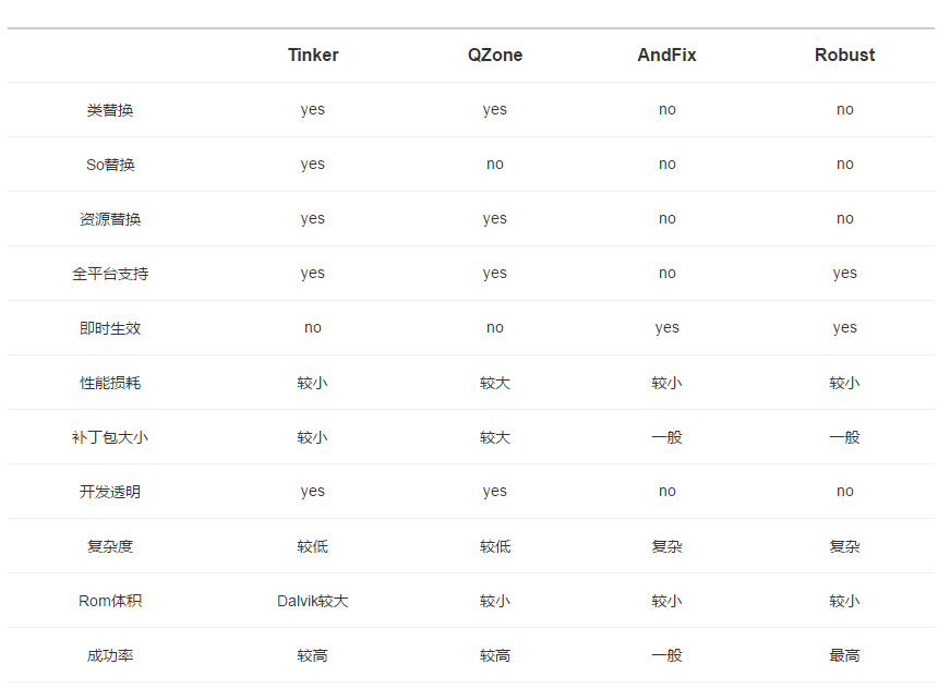 由于公司业务的需要,需要实现热修复功能,由于是微信官方的 Android 热补丁解决方案,因而选择它。下面简单看下各大方案的对比: