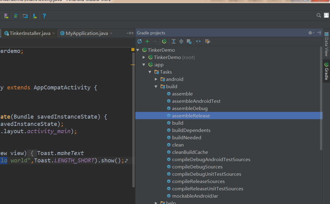 首先你需要到Tinker官网添加一个app,具体步骤看官方文档,这个时候会拿到一个AppKey,需要把tinkerpatch.gradle中的appKey换掉。简单说下我的MainActivity,其实就是一个text为Hello world的TextView,点击之后弹出Hello world 的Toaste.