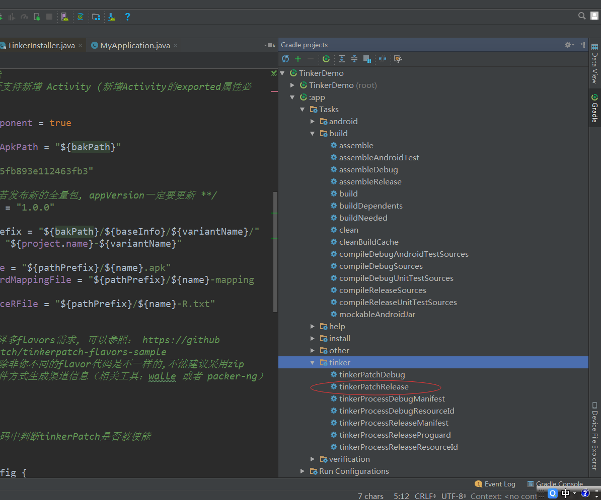 当然这些都是可以配置的在tinkerpatch.gradle中,注意的是,这三个文件要记得保存起来,因为要作为下次发布补丁的参数输入,路径要正确,建议放在一起,Tinker才能打出差异包。