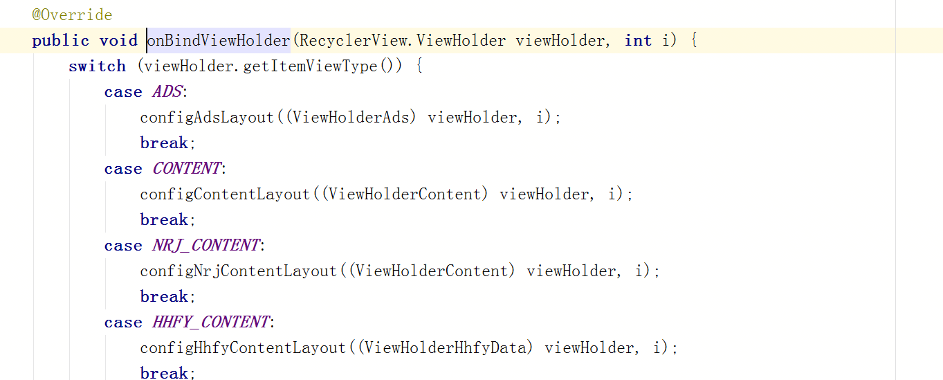 对于电商app来说,一个列表页面,会有多种布局,基本上都是在5个布局以上,且业务逻辑各自不同,非常复杂,导致的结果 就是adapter代码过于长了,十分不优雅。例如: