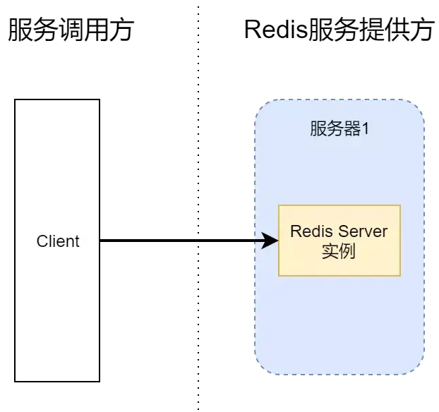 一般情况下,我们搭的个人网站,或者平时做开发时,会起一个单实例的Redis Server。调用方直接连接Redis服务即可,甚至Client和Redis本身就处于同一台服务器上。这种搭配仅适合个人学习娱乐,毕竟这种配置总会有单点故障的问题无法解决。一旦Redis服务进程挂了,或者服务器1停机了,那么服务就不可用了。并且如果没有配置Redis数据持久化的话,Redis内部已经存储的数据也会丢失。