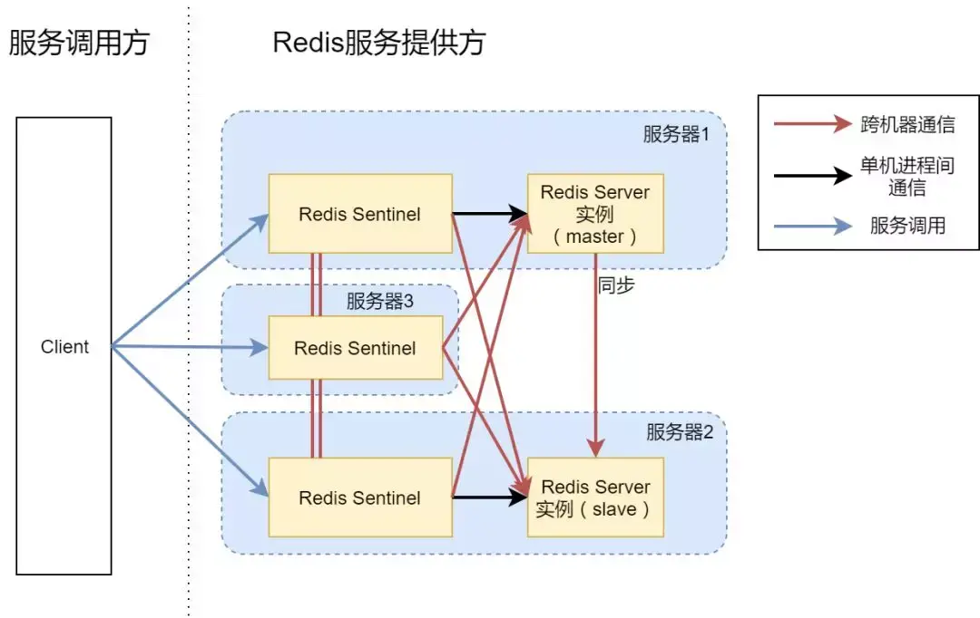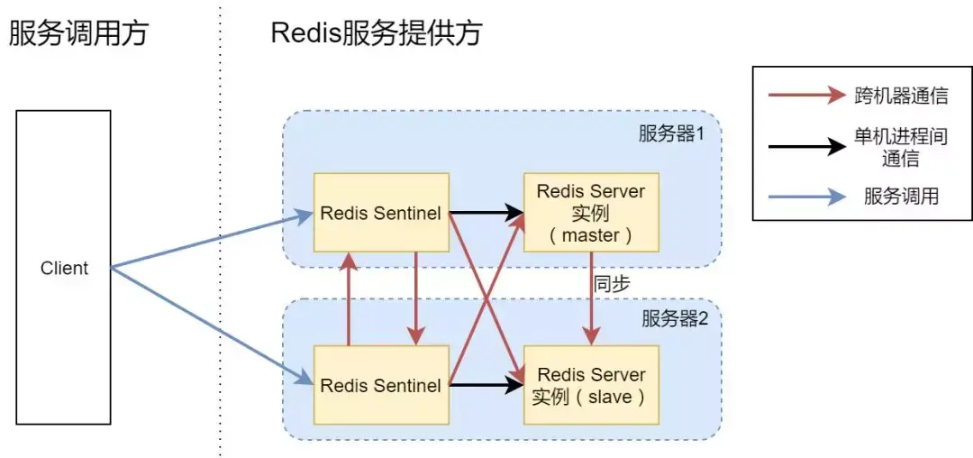 至此,我们就用3台机器搭建了一个高可用的Redis服务。其实网上还有更加节省机器的办法,就是把一个Sentinel进程放在Client机器上,而不是服务提供方的机器上。只不过在公司里面,一般服务的提供方和调用方并不来自同一个团队。两个团队共同操作同一个机器,很容易因为沟通问题导致一些误操作,所以出于这种人为因素的考虑,我们还是采用了方案4的架构。并且由于服务器3上面只跑了一个Sentinel进程,对服务器资源消耗并不多,还可以用服务器3来跑一些其他的服务。