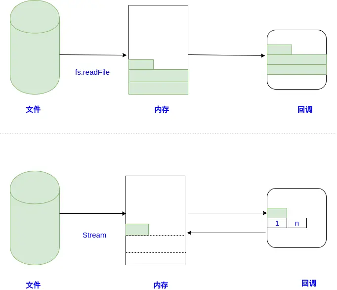 换用 fs.readFile 读取文件,程序不会被阻塞,但是所有的数据依旧会被一次性全部被读取到内存中。