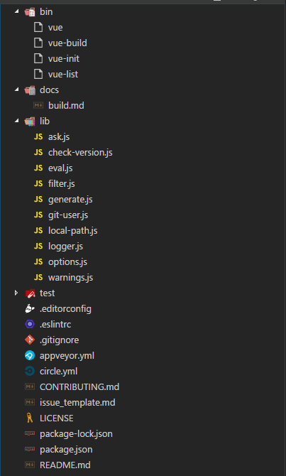 - bin //这里放的vue的一些命令文件,比如vue init这样的命令都是从由这里控制的