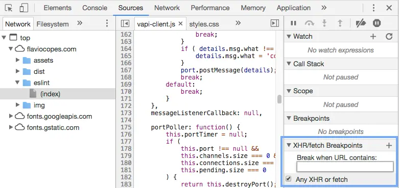 找到并打开XHR/Fetch Breakpoints面板,添加需要拦截的请求url