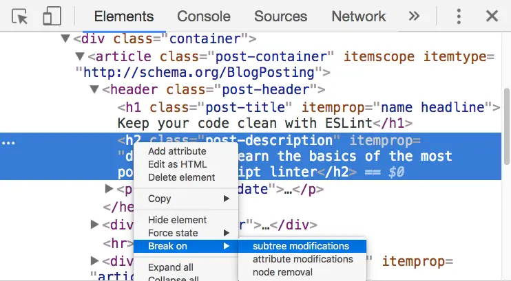 在Elements面板中,对选中的元素右键,启用Break on -> subtree modifications,任何改变该元素子节点内容的js操作将会被拦截