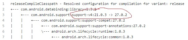 所有支持库都属于以下组 com.android.support。正如我们在 Gradle 的依赖关系树中看到的那样,com.android.support:support-v4:21.0.3 是唯一具有版本 21.0.3 并且未解析到最新版本的支持库 27.0.2,这就是造成冲突的原因。