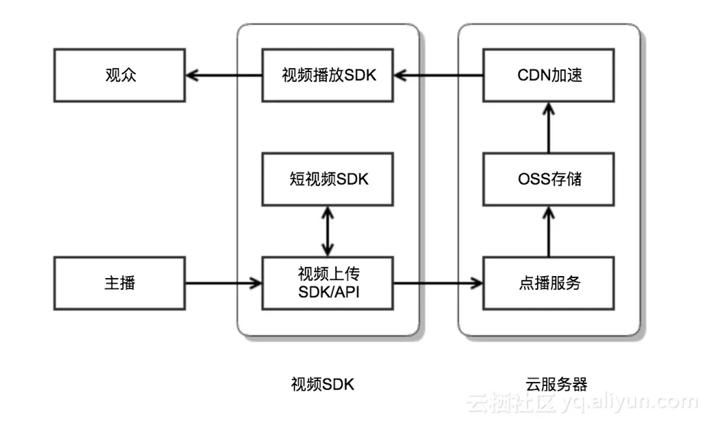 阿里云针对短视频的业务场景,提供了一整套技术解决方案。在主播端,提供了视频上传SDK和短视频SDK,在观众端提供视频播放SDK,在服务器端提供点播服务、OSS存储和CDN加速。