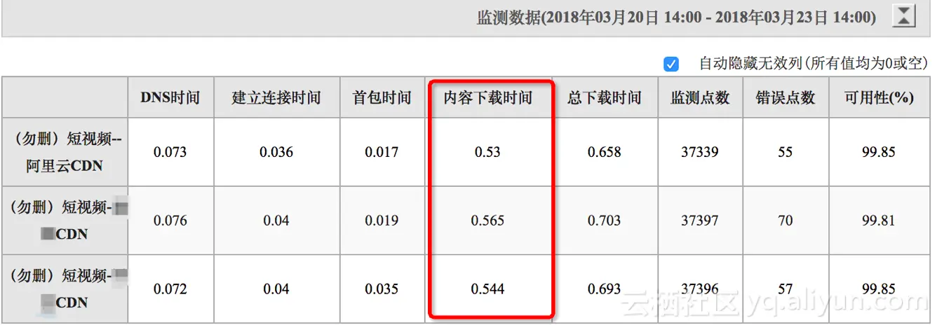 基于以上的优化,我们使用第三方检测平台,对某短视频业务1.2M文件,和其他CDN厂商做性能对比测试,相同文件大小从内容下载时间上看,使用阿里云CDN有2%-6%的性能提升。其余数据也表现优异。