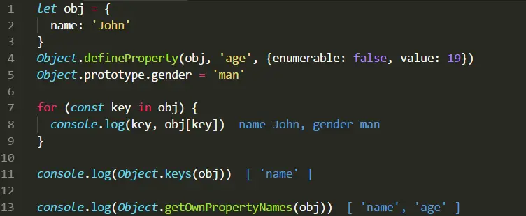 如下图,定义一个普通的对象 obj,具有 name 属性。然后,为 obj 添加一个不可枚举属性 age,并在原型上添加一个属性 gender。