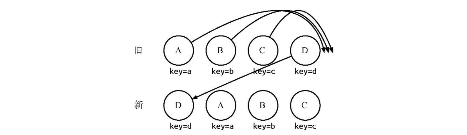 按照上述顺序优化,则旧集合中D的位置是最大的,最少的操作只是将D移动到第一位就可以了,实际上diff操作会移动D之前的三个节点到对应的位置,这种情况会影响渲染的性能。