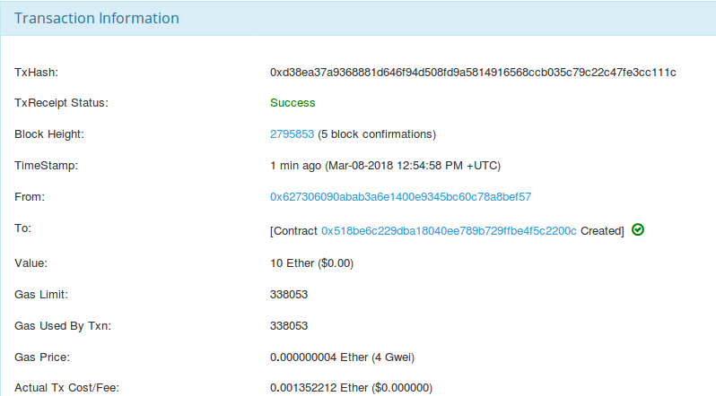 当 TX 完成后点击它,这将带你到那个 TX 的萎缩块链浏览器。我们可以在「to」字段下找到协议的地址。你的协议虽然不同,但看起来很相似。
