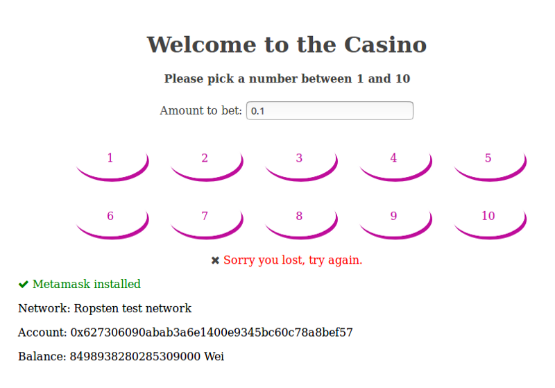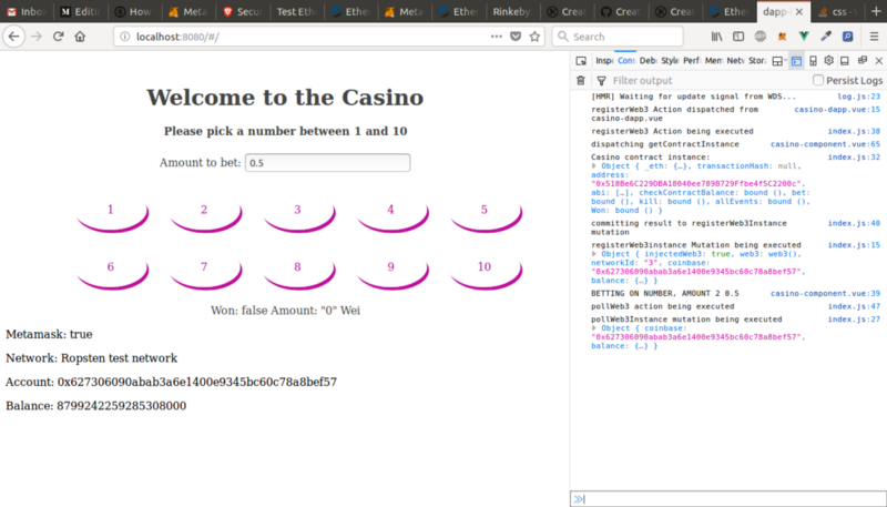 现在,我们可以通过在终端中运行 npm start ,并在浏览器中运行 localhost:8080 来测试我们的应用程序。输入金额并单击一个数字。Metamask 将提示您接受事务,旋转器将启动。在 30 秒到 1 分钟之后,我们得到第一次确认,因此也得到了事件的确认。我们的余额发生了变化,所以 pollweb 3 触发它的 action 来更新余额: