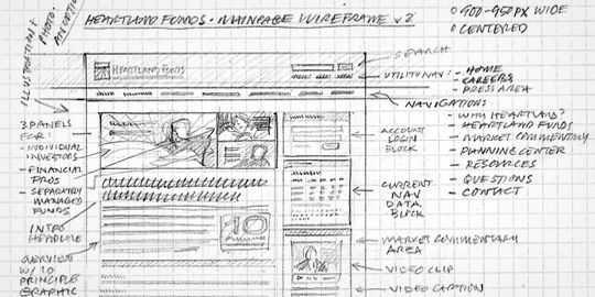 这个项目是给Heartland基金网站做重新设计。Heartland基金是一个位于美国威斯康辛州、密尔沃基市的一个中立基金机构。他们想要一个符合他们企业品牌的网站,好管理,能让访客觉得自己是“受欢迎”的就行。我用铅笔在格格本上画出了框架,去捕捉我关于结构的想法,还在草图边上加了一些备注,有助于客户理解。