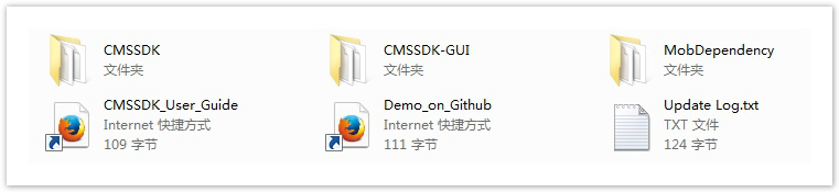 如果在Mob官网下载了CMSSDK的资源包,你会发现三个文件夹和三个快捷方式和一个txt文本。